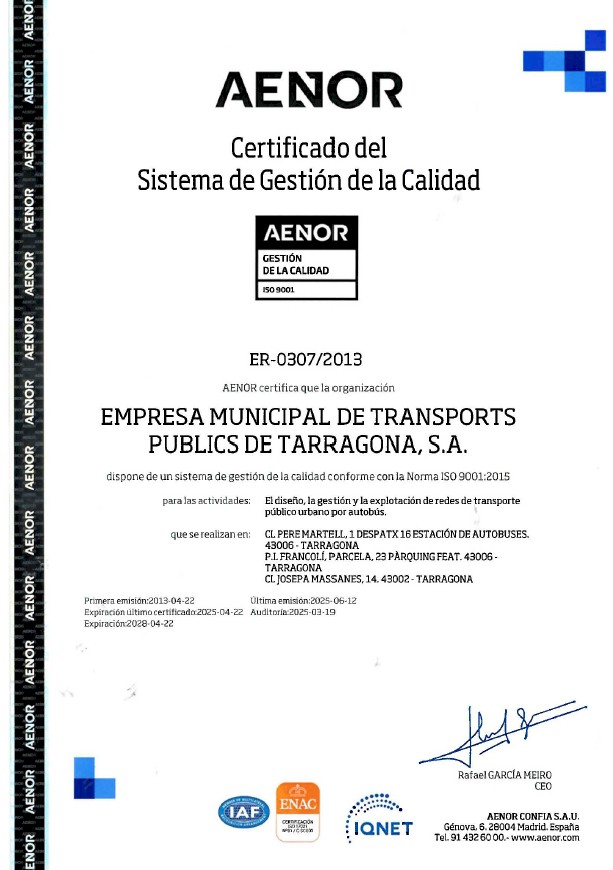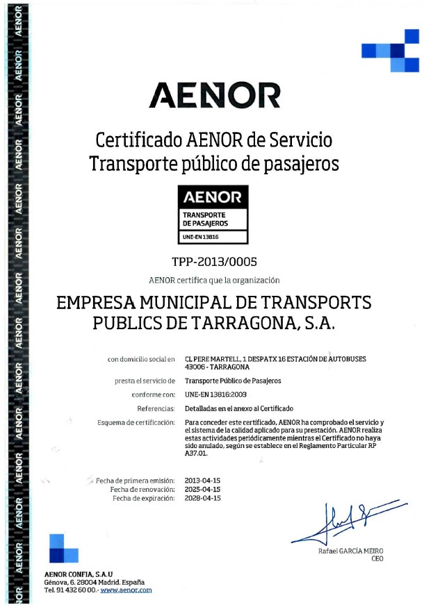 A l’Empresa Municipal de Transports Públics de Tarragona estem orgullosos d’haver renovat, aquest 2025, la certificació certificat d’AENOR conforme a la norma UNE-EN 13816:2003, específica per a serveis de transport públic de viatgers.